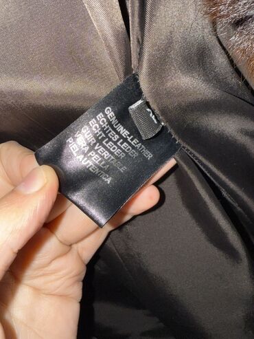 - Material: 100% həqiqi dəri (etiketdə “Genuine Leather / %100 Leather” göstərilib), içlik atlas-parıltılı astar. Ön hissələr və böyük yaka qalın, parlaq tüklü kürk panellərlə işlənib.