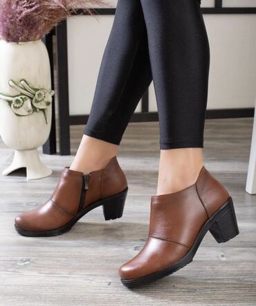 Qadın üçün dəri qısa çəkmə - Rəng: tünd qəhvəyi - Model: topuqlu, qısa booti - Material: üst hissə – təbii dəri; içlik – yumşaq dəri/ximayə - Ölçü: 39 (etiketdə “02 5503 39” qeyd olunub) - Marka: ...
