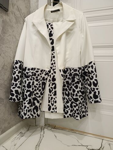 - Üst geyim: ağ rəngdə, aşağı hissəsi və qolların yarısından etibarən qara-ağ leopard (animal print) naxışlı dizayn. Klassik yaxalı, ön tərəfdə incə bağlama detallı. İri ön ciblər.