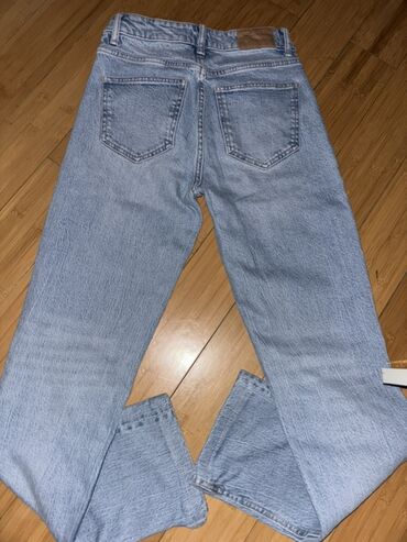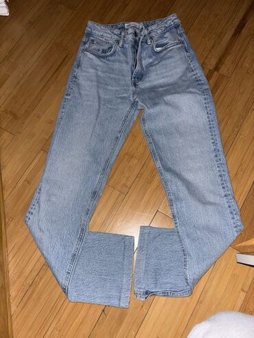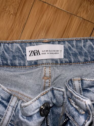 ZARA qadın cins şalvar - Model: klassik beş ciblə düz kəsim (straight) - Bel: yüksək bel - Rəng: açıq mavi “washed” denim - Bəylər: metal düymə və fermuar bağlanma, mis rəngli rivetlər - P...