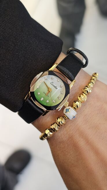 Qadın qol saatları – zərif dizayn, qızılı çərçivə - Korpus: parlaq qızılı ton, bəzək daşı detalları ilə - Siferblat: qara fonlu; variantlara görə naxışlı (çiçək/ürək/ulduz/mandala tipli) dizayn, ox...