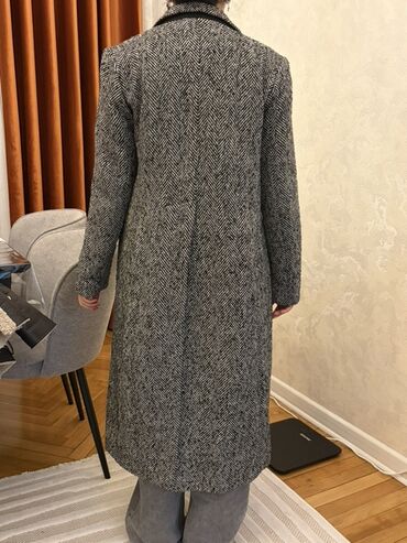 Klassik qadın palto - Rəng: tünd boz/qrfi̇t, xırda çəp zolaqlı (herringbone) naxış - Model: dizdən yuxarı uzunluq, geniş aşağı düşən çiyinli, klassik rever yaxalı - Bağlanma: iki ədəd ön düymə (pa...