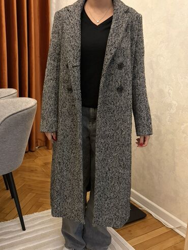 Qadın palto - Rəng və naxış: Qara-ağ qarışıq, xırda toxumalı desən - Model: Uzun, oversize kəsim, ikiqat düyməli (double-breasted) - Yaxa: Geniş şal yaxa - Qol: Manjetli, qayışlı büzgülü detallarl...