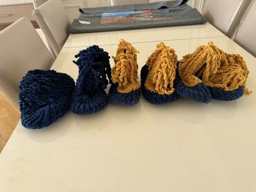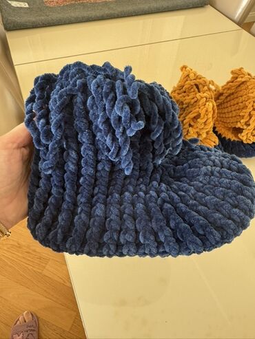 Uşaq üçün. Əl işi toxunma ev ayaqqabıları (3 ədəd dəst) - Material: yumşaq, qalın sapla əl toxuması - Rənglər: firuzəyi, boz və tünd lacivərd kombinləri - Modellər: barmağı qapalı, yun toxunuşlu, ...