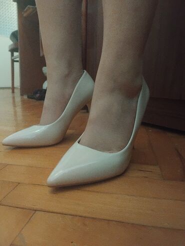 Ağ rəngli klassik qadın tufliləri - Model: şipli, nazik uzun daban (stiletto) - Burun forması: iti/uc - Material: parlaq laklı üst səth, içlik bej tonlarda - Ölçü: 240 (təxminən 37-37.5 ölçüyə uyğu...