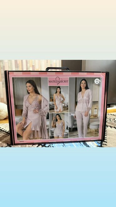 Zərif pudra rəngində, dəbdəbəli krujeva detalları ilə qadın gecə-geyimi dəsti. Qutulu dəst “Dowry Set” olaraq təqdim olunub və eyni rəng palitrasında bir-birini tamamlayan bir neçə kombinasiya imkanı verir.