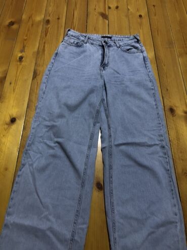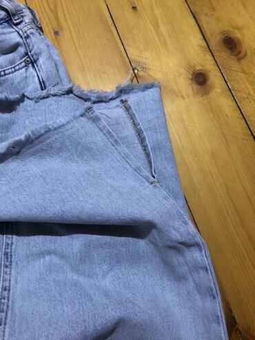 Açıq mavi rəngdə, enli biçimli cins şalvar. Yüksək belli dizaynı ilə həm rahat, həm də dəbli görünüş təqdim edir. Gündəlik geyim üçün idealdır. 46 razmerdir, 100kg a qeder geyinile biler. Boyuk gel...