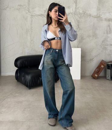 Məhsul: Qadın geniş kəsimli jeans şalvar - Rəng: Klassik açıq-mavi denim, yumşaq “washed” effekti ilə - Kəsim: Geniş paça (baggy/loose fit), rahat oturuş, düz kəsimli balaq - Bel: Orta bel (mid-ri...