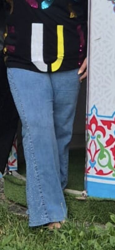 Geniş kəsimli, açıq mavi “stonewash” effekti olan cins şalvar. - Siluet: Wide-leg/bol paça, yüksək və ya orta belə yaxın oturuş. - Material: Klassik denim (pambıq əsaslı), möhkəm tikişlər. - Dizayn...