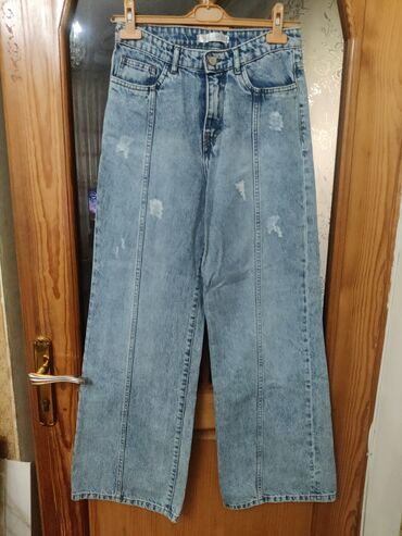 Yüksək belli, geniş kəsimli cins şalvar - Parça: açıq mavi denim - Kəsim: straight/relaxed fit, yüksək bel - Detallar: diz və baldır hissələrində cırıq-effekt yırtıqlar, yan və arxa ciblər, fermua...