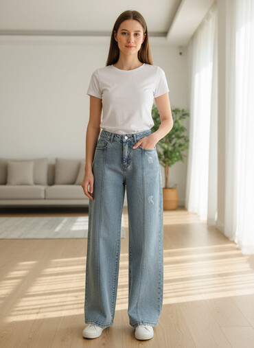 Yüksək belli, geniş kəsimli cins şalvar - Parça: açıq mavi denim -