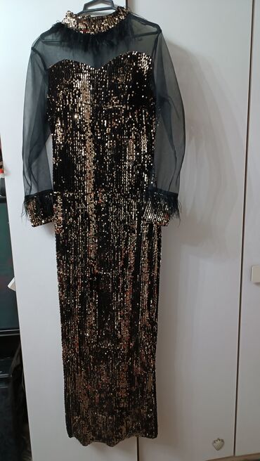 Materiallar: payetli parça, şifon (qollar və üst qat), dekorativ tüklər
