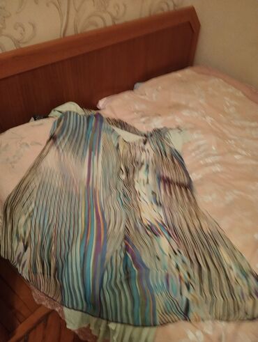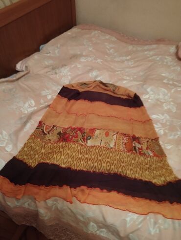 - Narıncı tonlarda şifon paltar/kofta: Yüngül, yarıkeçirən parça. Üfüqi bantlar və etnik-motifli panellər, tünd bənövşəyi və qırmızı detallarla. Aşağı hissədə dalğalı kənarlar, rahat, geniş kəsim.