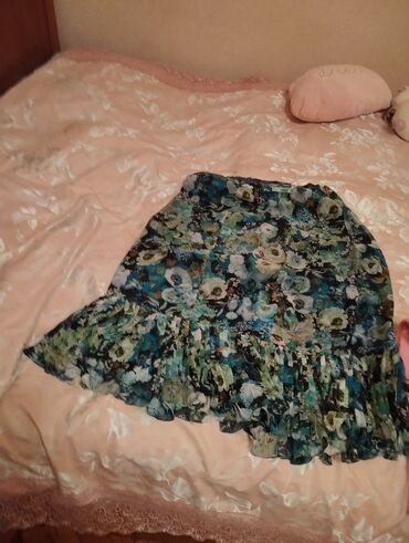 - Çoxrəngli pliseli ətək: Açıq yaşıl astarlı, yüngül və dalğalı parça. Şaquli zolaqlı-abstrakt naxışlar — mavi, bənövşəyi, bej və yaşıl tonlarda. Dizdən aşağı uzunluq təsiri verir, elastik bel hissəsi görünür.