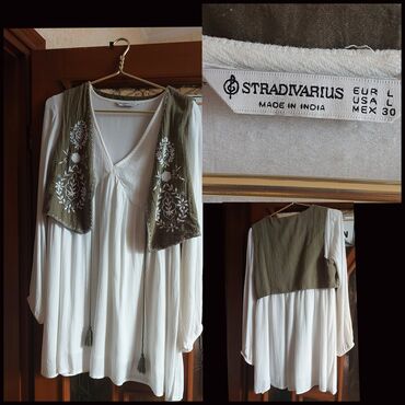 Satılır – qadın geyimləri seçimi: 1) Rozuvu paltar - Ölçü: 38 - Ön hissədə qızılı dekor panellər və beldə bəzək zolağı - Dizə qədər uzunluq, qolsuz, yumşaq axıcı parça - Qiymət: 5 azn 2) Qara bəz...