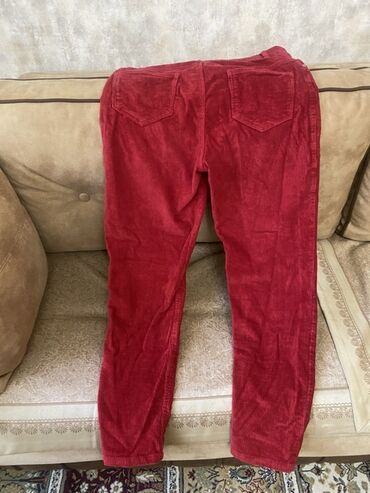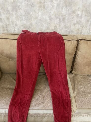 - Qırmızı məxməri/ştayn şalvar: Dar kəsimə yaxın siluet, fermuarlı və düyməli ön bağlanış, kemər ilgəkləri. Yumşaq, xətli (corduroy) toxuma, gündəlik şəhər tərzinə uyğun.