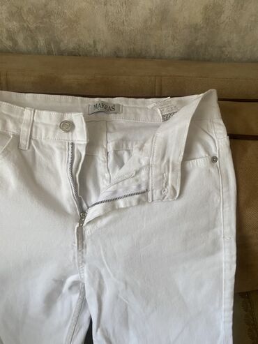 - Ağ cins şalvar: Makras brendi, klassik düymə və fermuar bağlanışı, 5 ciblə (iki yan, iki arxa, bir sikkə cibi), kemər üçün ilgəklər. Düz kəsim, yüksək belə yaxın oturuş. Ağ denim parça, gündəlik və yay kombinləri üçün uyğundur.