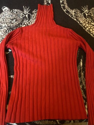 - Qırmızı trikotaj sviter: Uzunboğaz (balıqçı yaxa), uzunsov şaquli rezin tikişli (ribbed) tekstura, uzunqol, bədənə yüngül oturan siluet. Qat-qat geyimlər və qış payız kombinləri üçün əlverişli.
