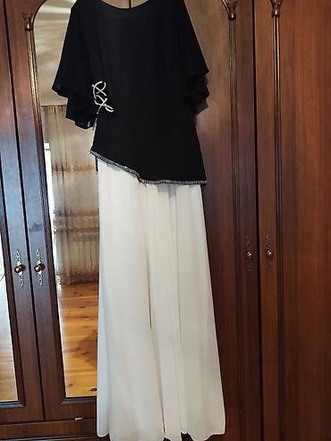 - Alt: geniş kəsimli ağ şifon şalvar hissəsi, axıcı siluet