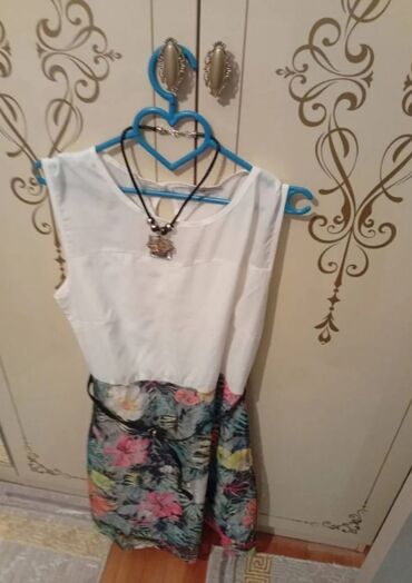 - Yay paltarı: üst hissə ağ, alt hissə tropik çiçək naxışlı eteklə birləşən modellidir. Yüngül parça, bel hissəsində nazik kəmər detallıdır. Boyun hissəsində aksesuar kimi qara iplə asılmış kulon görünür.