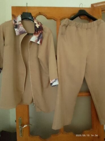- Bej rəngli iki hissəli dəst: uzun, açıq fason üst geyim və uyğun şalvar.