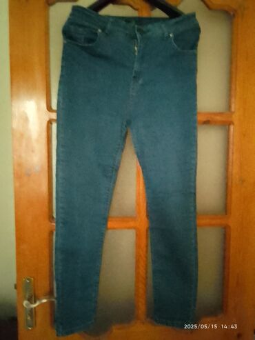 - Mavi rəngli jeans şalvar: klasik düz kəsim, hündür bel, ön düymə və fermuar bağlanması, yan ciblər. Rahat gündəlik istifadə üçün uyğundur, tünd mavi denim.