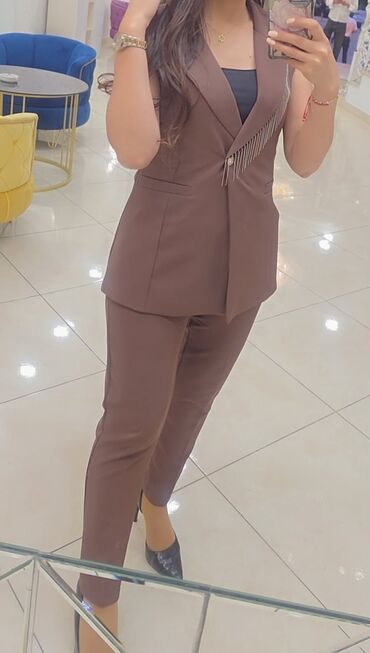 - İki hissəli kostyum: şokolad rəngli qadın kostyumu – yüngül oversize blezer və dar, düz kəsimli şalvar. Blezerin ön hissəsində metal sallantı (fringe) bəzəyi və tək düyməli bağlanma, yanlarda dekorativ ciblər. Şalvar orta bel, topuqboyu.Qiymet-50azn