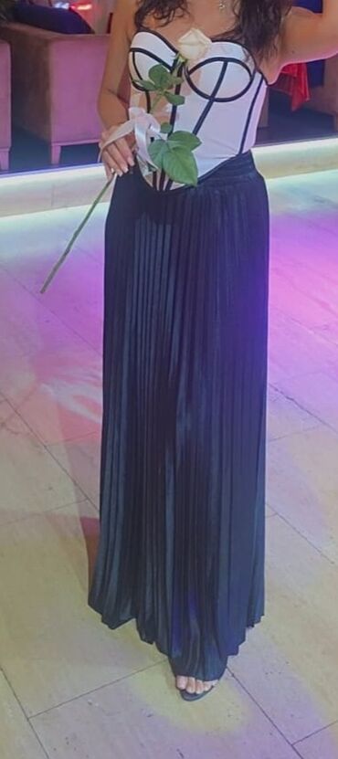 Qadın geyim dəstləri 1) Qara iki hissəli dəst - Brend: Dqmane (etiketdə XS göstərilir) - Üst: qısa qollu, dairəvi yaxalı bluz. Aşağı hissədə dalğavari kəsimli dekorativ panellər, ağ tikiş detallar...