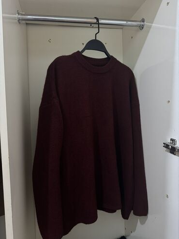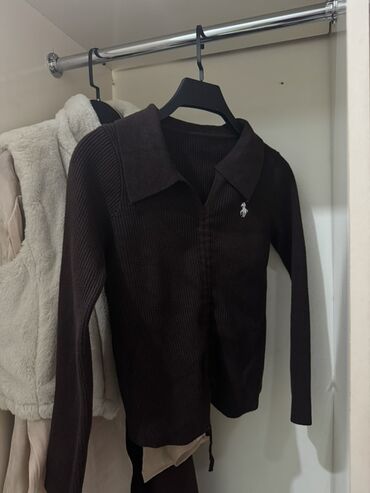 - Tünd qəhvəyi trikotaj kardiqan: uzunqol, geniş klassik yaxa, ön hissədə yüngül büzməli kəsim, sinədə kiçik at-fiqurlu ağ naxış/loqo detalı.