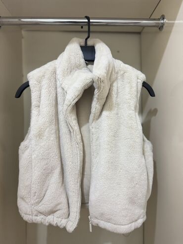 - Ağ-krem rəngli tük kimi yumşaq gilət: fermuarlı, dik yaxalı, alt hissədə elastik yığma, isti saxlayan flis/şerpa tipli material.