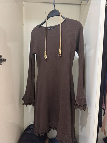 - Qəhvəyi trikotaj don: incə şaquli rezinli tekstura, uzunqol, dairəvi yaxa, ətək və qollarda dalğalı (ruffle) kənarlar. Brend etiketində “Zara Knitwear”.