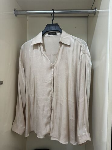 - Krem rəngli uzunqol köynək: yumşaq, parıltılı/atlas effektli parça, klassik yaxa, ön hissədə düymələmə, rahat kəsim.