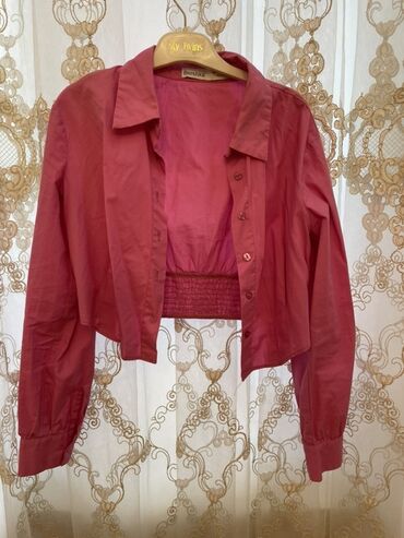 4) Bershka markalı qırmızı/çəhrayı qısa köynək – yaxalıqlı, uzunqol, ön hissəsi düyməli. Arxa bel hissəsi elastik büzgülü, qısa kəsim sayəsində yüksək belli alt geyimlərlə uyğunlaşır.