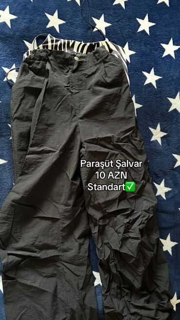 - Qara paraşüt şalvar. Yazı: “Paraşüt Şalvar, 10 AZN, Standart”.
