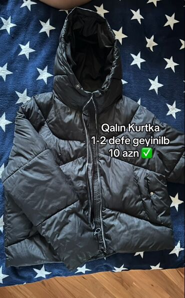 - Qalın qara kapüşonlu kurtka. Yazı: “Qalın Kurtka, 1-2 dəfə geyinilib, 10 AZN”.