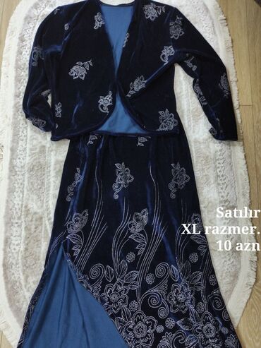 3) Tünd mavi məxmər dəst (jaket + ətək)