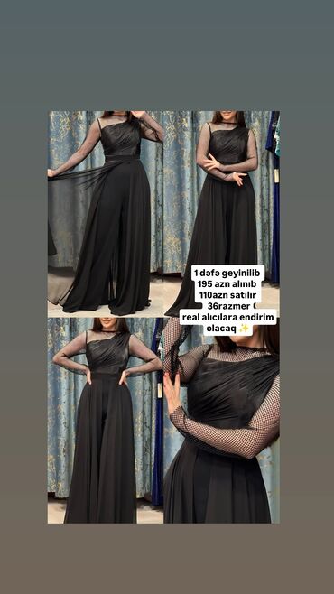 Qadın geyimləri – 3 ədəd paltar dəsti 1) Qara şifon üst geyim/kimono: - Yüngül, axıcı şifon parça - Ön hissədə və qolların ucunda gümüşü payet naxış - Açıq önlü dizayn, rahat kəsim - Dizə yaxın uz...