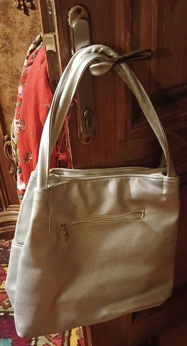 Gümüşü rəngli qadın çantası - Material: yumşaq eko‑dəri - Rəng: metalik gümüş - Tip: çiyin çantası, iki qalın və rahat qulplu - Bağlanma: üst hissədə əsas bölmə üçün fermuar - Daxili: geniş əsas b...