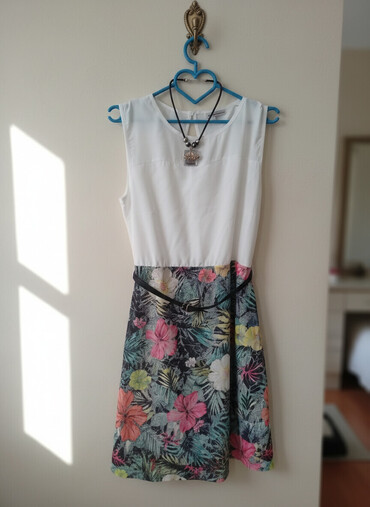 - Ətək hissəsi tropik/çiçək naxışlı, çoxrəngli dizaynla.