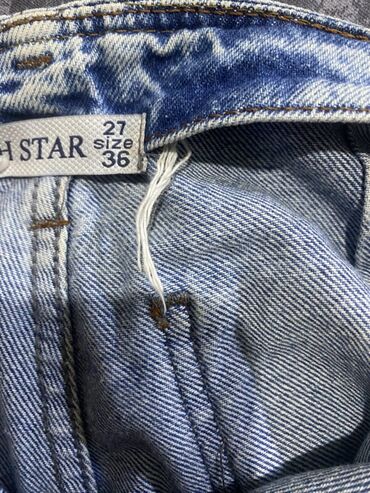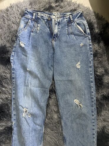 Yüksək belli, geniş kəsimli cins şalvar - Parça: açıq mavi denim - Kəsim: straight/relaxed fit, yüksək bel - Detallar: diz və baldır hissələrində cırıq-effekt yırtıqlar, yan və arxa ciblər, fermua...