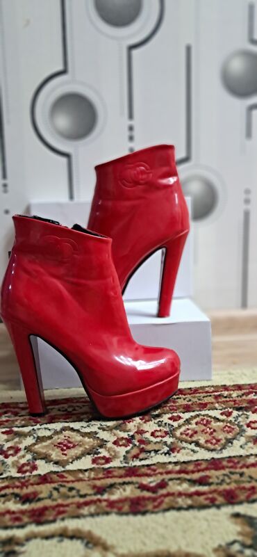 - Model 4: Qırmızı laklı platformalı bot. Yüksək daban və nazik platforma, yan hissədə kabartma loqo detalı, qapalı burun, parlaq lak örtük.