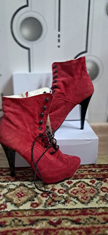 - Model 3: Qırmızı süet bağlamalı bot. Orta-hündür nazik daban, yan tərəfdə dekorativ düymələr və ön hissədə bağcıq, iç hissəsi açıq rəng astar.