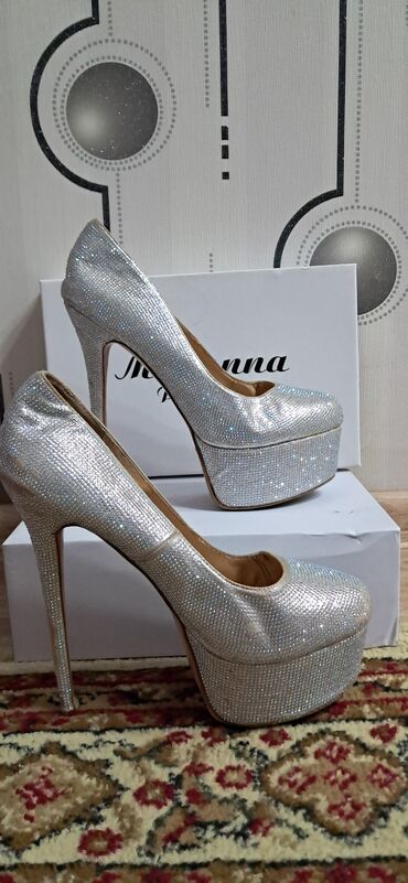 - Model 2: Gümüşü platformalı stiletto. Yüksək platforma və çox hündür nazik daban, üstü bütövlükdə kristal effektli xırda daşlarla örtülü, burun hissəsi yumru kəsim.
