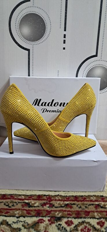 - Model 1: Parlaq sarı stiletto. İti burun, nazik hündür daban (təxminən 10-11 sm), üst hissə xırda daşlarla bəzədilmiş, altlıq qara rəng. Qutu üzərində “Madonna Premium” yazısı görünür.