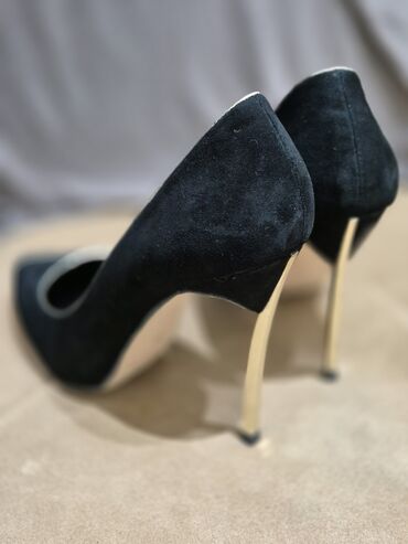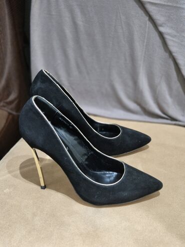 Qadın yüksək dabanlı tufli - Rəng: qara - Material: zərif məxməri/semşaya bənzər üst qat, içlik qızılı rəngdə - Model: sivri burunlu, nazik stilet daban - Bəzək: burunda qızılı rəngli metal detal ...10 AZN