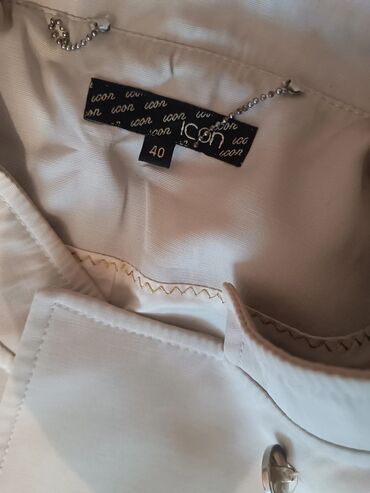 ICON qadın trençkotu – ölçü 40 - Rəng: açıq bej/ekru - İkiqat düymələmə (double-breasted) – parlaq metalik düymələr - Yüksək yaxalı dizayn - Çiyin epoletləri və dekorativ metal detallar - Qol manj...