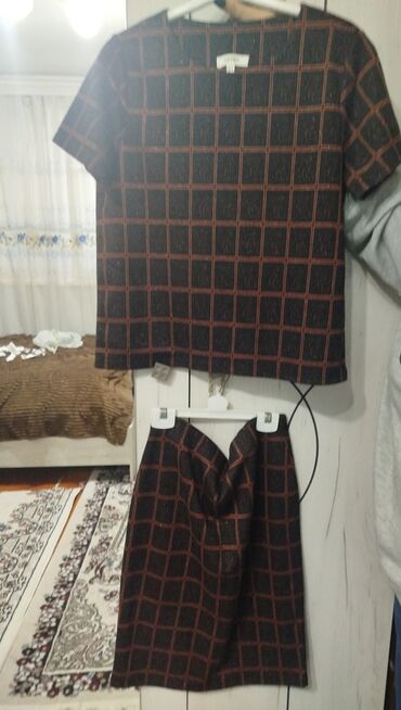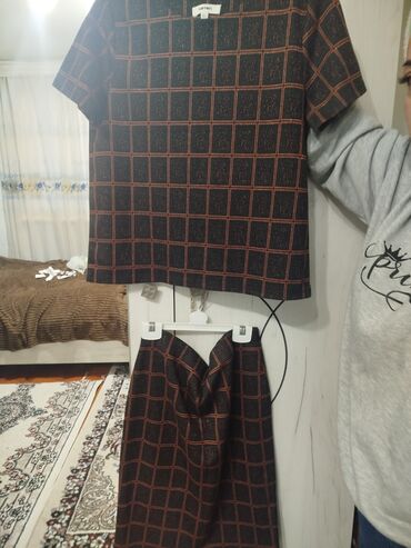 Qara fon üzərində ağ çiçək naxışlı iki hissədən ibarət qadın dəsti. Dəst uzun ətək və uyğunlaşan bluzdan ibarətdir. - Ətək: A-çəkmə siluet, qələm-ətəkdən daha rahat kəsim; yanda yarıqla hərəkət ra...