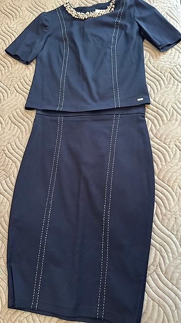Tünd göy rəngdə, qısa qollu, mirvari bəzəkli yaxası olan zərif bluz və düz biçimli ətəkdən ibarət dəst. Bluzun və ətəyin ön hissəsində dekorativ tikişlər var. Dəst xüsusi günlər və ya rəsmi tədbirlər üçün uyğundur. 1-2 dəfə geyinilib