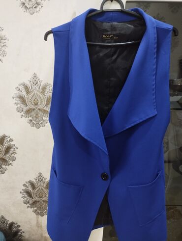 Qadın üçün uzun, qolsuz jilet - Rəng: kobalt mavi, qara geniş atlas tipli yaxalıq - Kəsim: düz, açıq önlü (bağlanışsız) - Üzərində iki yan ciblə (dekorativ/haşiyəli) - Material: orta qalınlıqda par...
