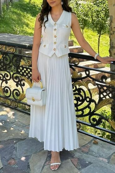 - 2 hissədən ibarət: qolsuz jilet və pliseli uzun ətək